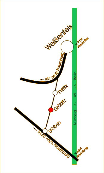 Von der A9 die Abfahrt Naumburg abfahren, danach die B180 in Richtung Naumburg fahren. In Stößen in Richtung Weißenfels rechts abbiegen. Das nächste Dorf ist bereits Gröbitz. Dort die erste Straße scharf links abbiegen - der Lohweg.